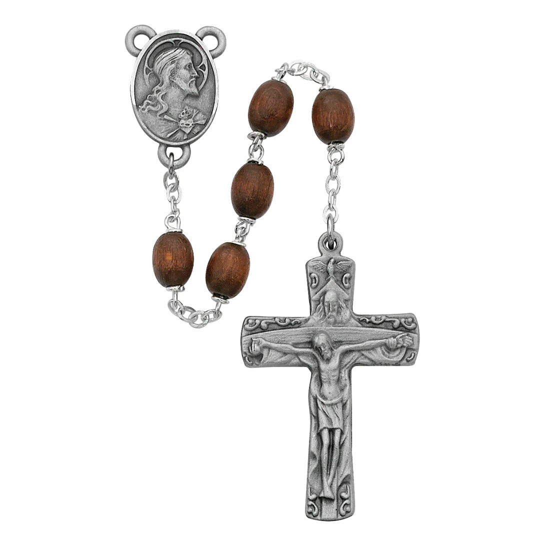 6x8mm brown wood beads with pewter center and Trinity crucifix. Deluxe gift boxed