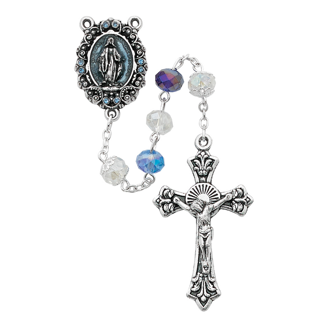 8mm blue multi crystal beads with silver oxidized crucifix and enameled with stones center. Deluxe boxed.