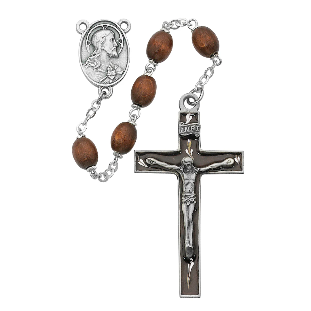 6x8mm brown wood beads with pewter center and enameled crucifix. Deluxe gift boxed.