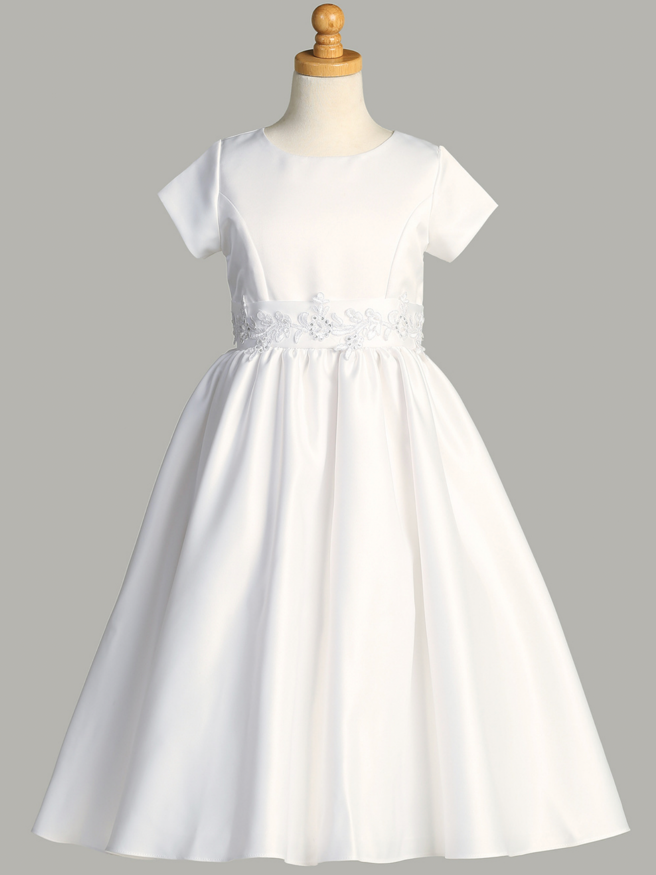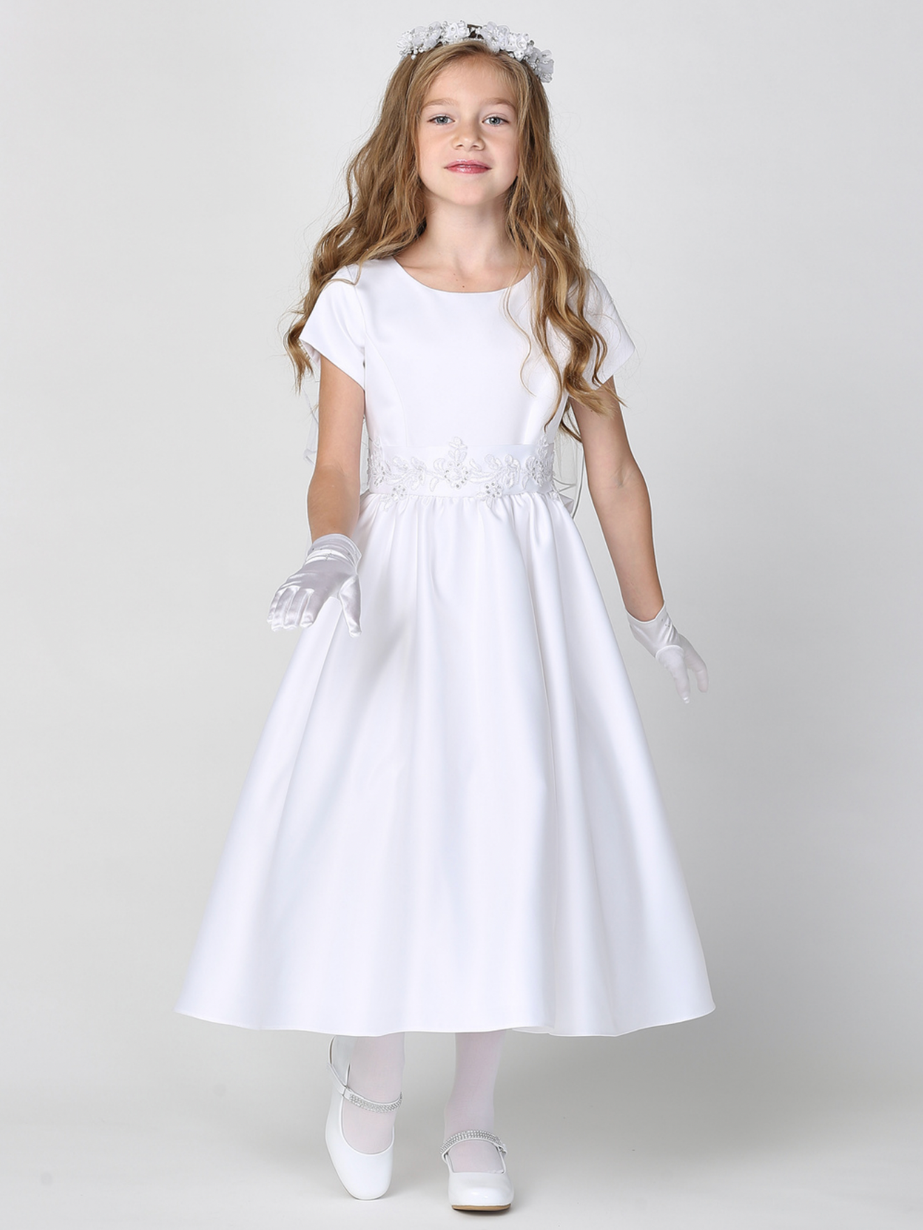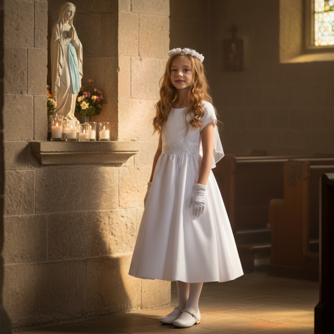 This exquisite First Communion dress from Lito combines timeless elegance with superior American craftsmanship. Crafted from luxurious satin fabric, this tea-length gown features delicate silver corded trim that gracefully accents the waist, creating a flattering silhouette for your daughter's sacred milestone. The classic design ensures she'll feel confident and beautiful as she receives this important sacrament, while the quality construction means this dress can become a cherished keepsake for years to come.