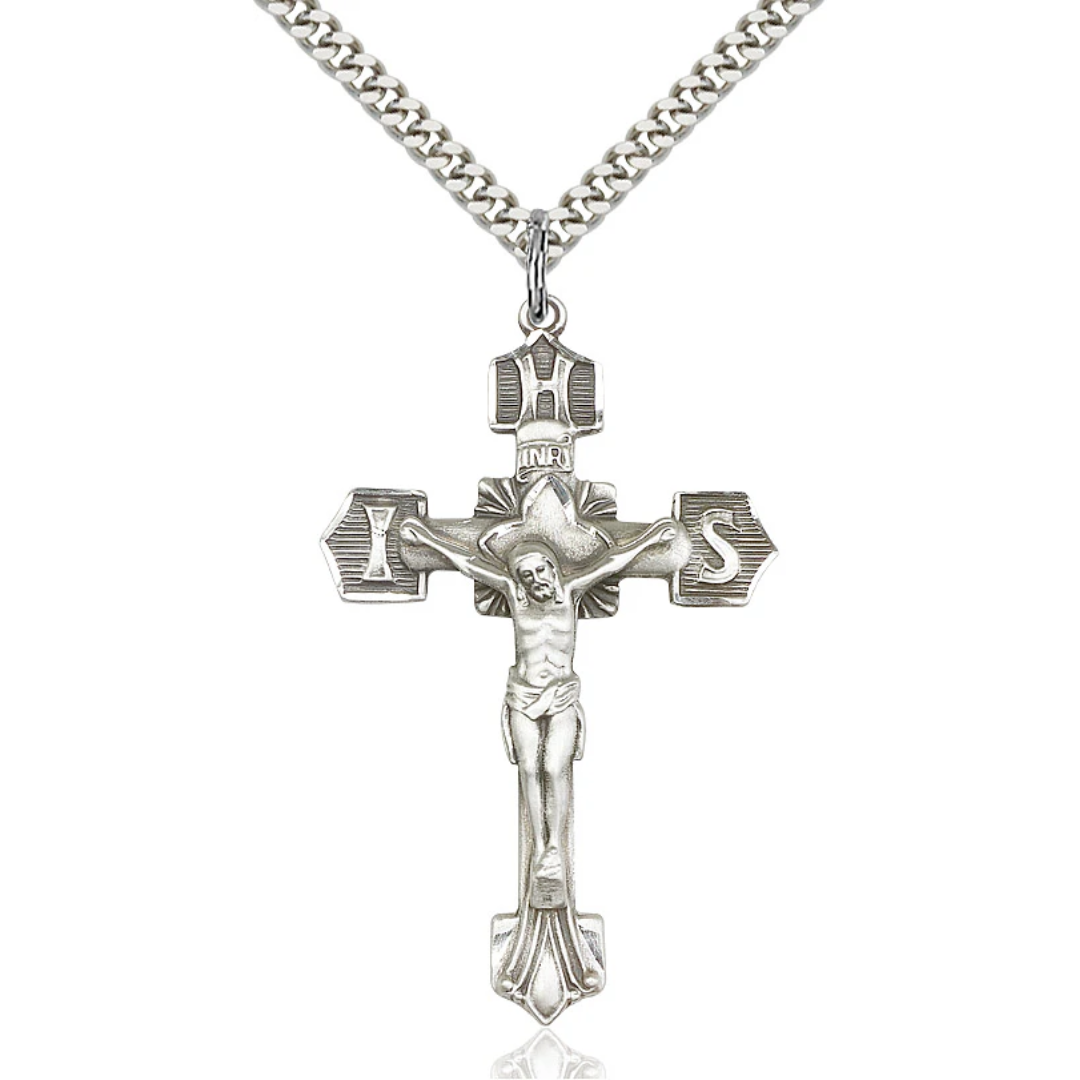 1 3/4 x 1 1/8 Sterling Silver Crucifix Pendant on a 24 Inch Light Rhodium Heavy Curb Chain
