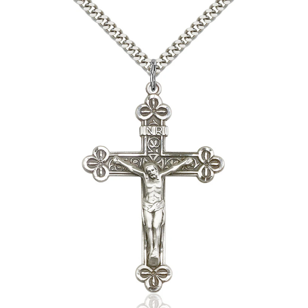 1 7/8 x 1 1/4 Sterling Silver Crucifix Pendant on a 24 Inch Light Rhodium Heavy Curb Chain