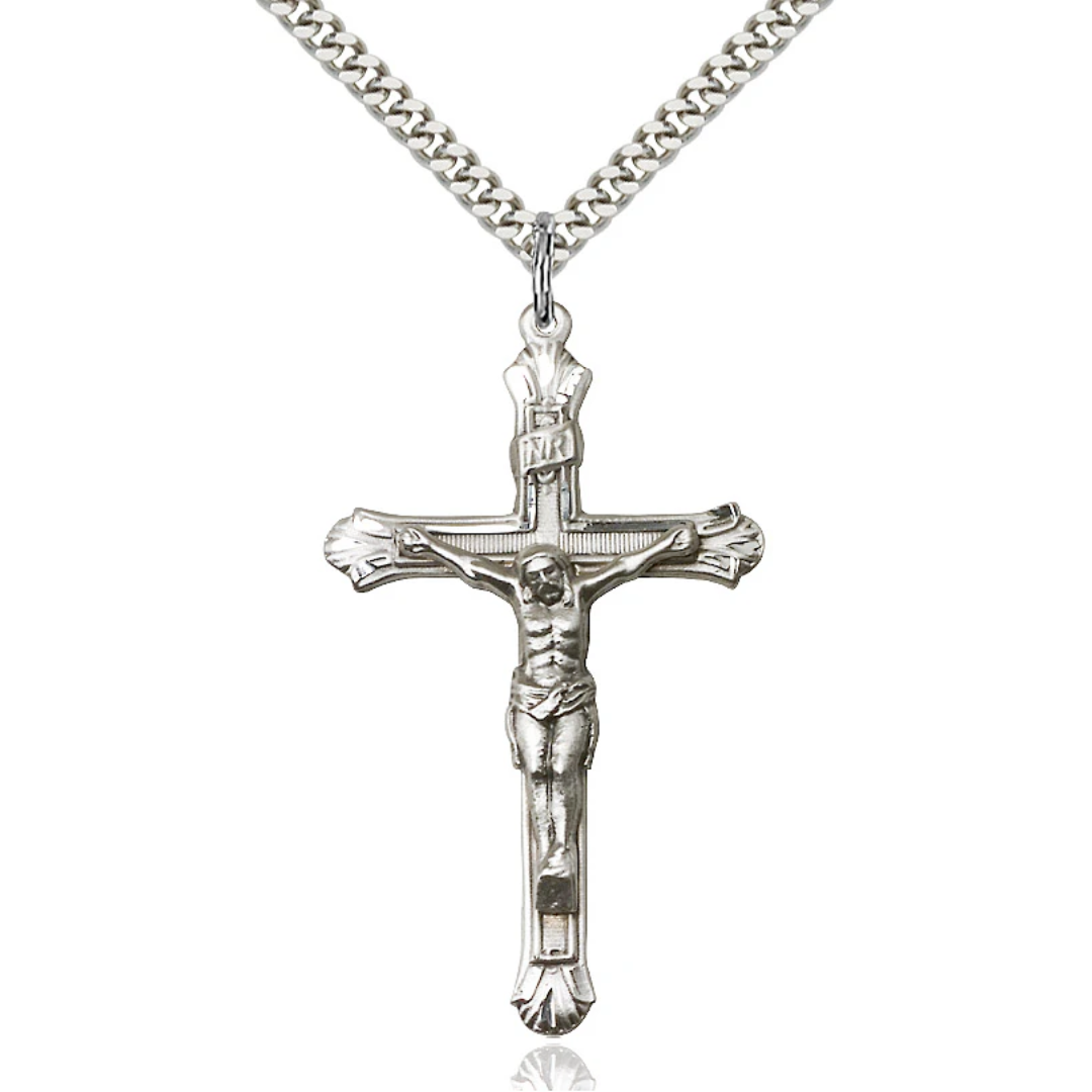 1 7/8 x 1 Sterling Silver Crucifix Pendant on a 24 Inch Light Rhodium Heavy Curb Chain