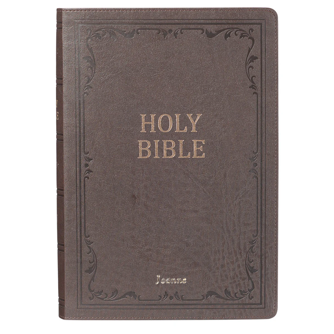 The Dark Brown Faux Leather Super Giant Print King James Version Bible comes packaged in a sturdy, hinged gift box. Complete the presentation page, included in the front of the Bible, when it is presented as a gift. The elegant yet understated design of the Dark Brown Faux Leather Super Giant Print King James Version Bible makes it a good choice for a woman with a traditional style who needs a larger print Bible.