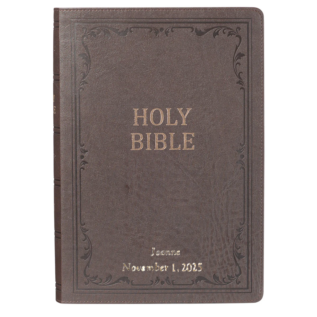 The dark brown faux leather cover of the super giant print Bible features a simple heat-debossed frame accented with a flowing leaf design. The title is gold-foiled on the front cover.