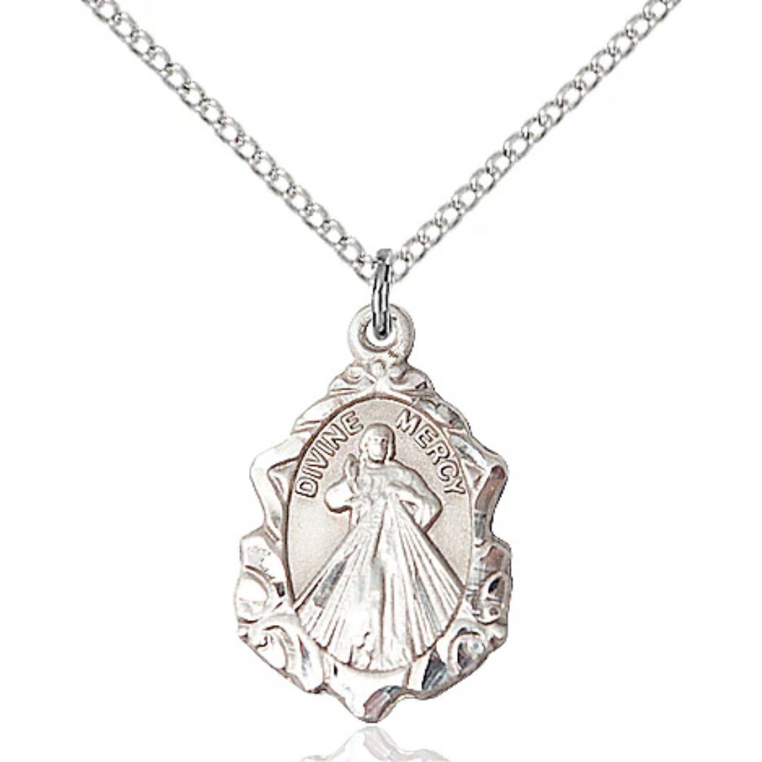 3/4 x 1/2 Sterling Silver Divine Mercy Pendant on a 18 inch Sterling Silver Light Curb Chain