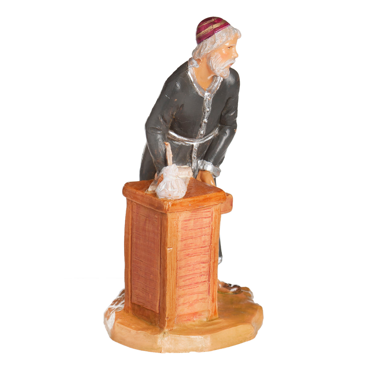 Zacchaeus is shown at his table, leaning over scrolls and coins that mark his life as a tax collector. His dark robe and thoughtful stance capture both his failings and his turning point”when Jesus called his name, Zacchaeus chose redemption and vowed to repay all he had taken. Hand-painted with care, this figure is a powerful reminder of transformation and a meaningful addition to any Fontanini collection.