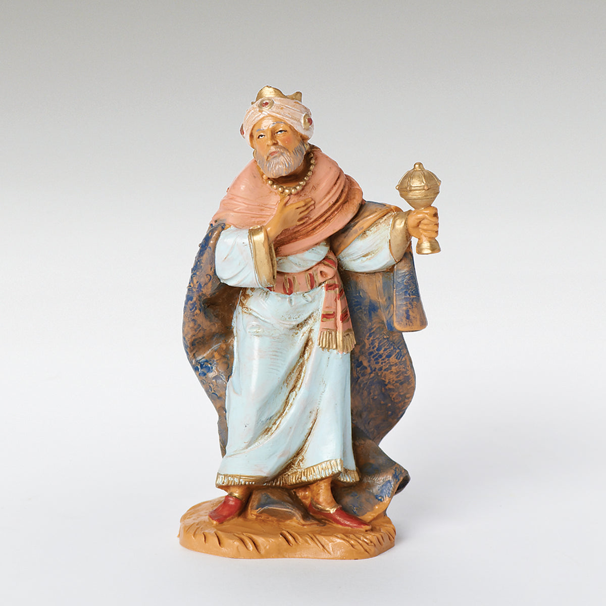 Gaspar captures the moment of a king bringing his gift before the newborn Christ. Dressed in a flowing white robe with gold trim, a coral sash, and a sculpted turban, Gaspar carries one of the most meaningful gifts of the nativity storyš symbolizing worship and the divine nature of the newborn King.