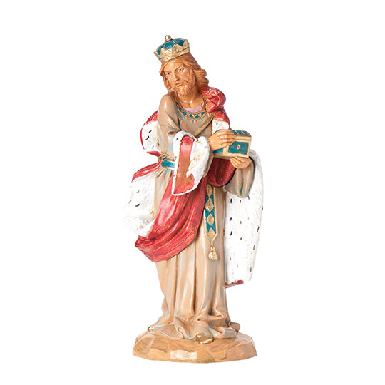 King Melchior is traditionally remembered as the Magi who presented gold to the Christ Child, a gift symbolizing kingship and honor. This figure portrays Melchior in regal robes trimmed with rich detail, a jeweled crown upon his head, and his offering held with reverence. His posture conveys both dignity and humility as he kneels in spirit before the newborn King. Together with Gaspar and Balthazar, Melchior enriches your collection with beauty and meaning, celebrating the Epiphany and the journey of faith that led them to Bethlehem.