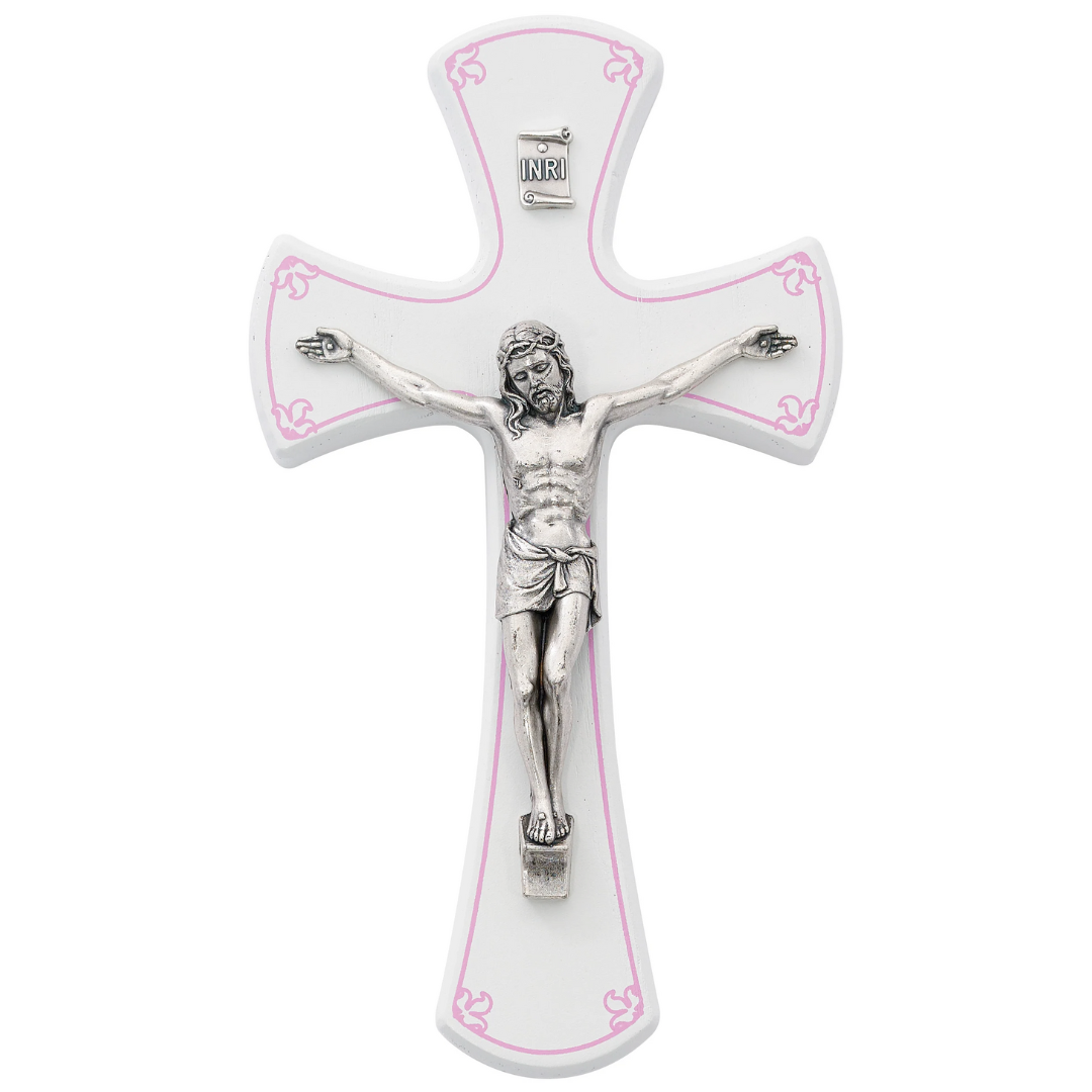 6in White wood crucifix with pink silk screen and pewter corpus. Comes boxed. Made in the USA.