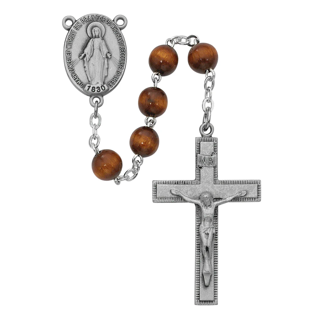 7mm brown wood round beads with sterling center and crucifix. Deluxe gift boxed.