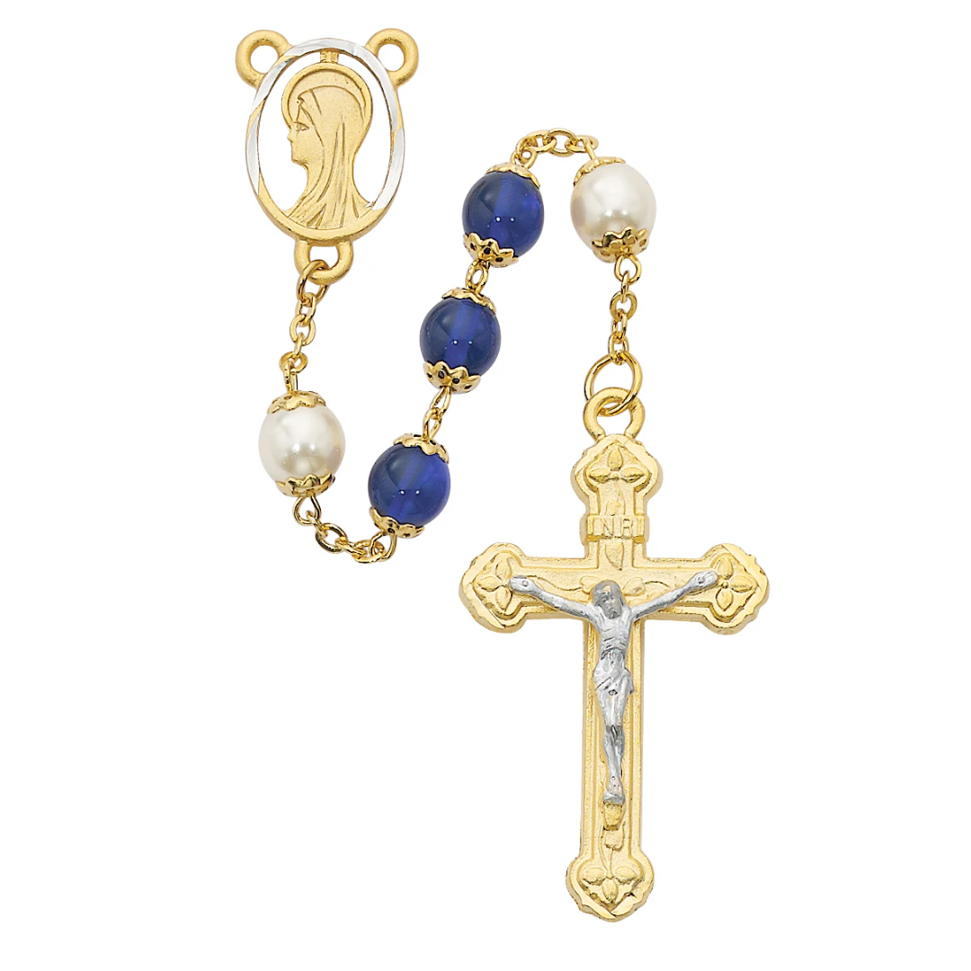 8mm Blue and pearl like glass capped beads with gold plated pewter center and crucifix