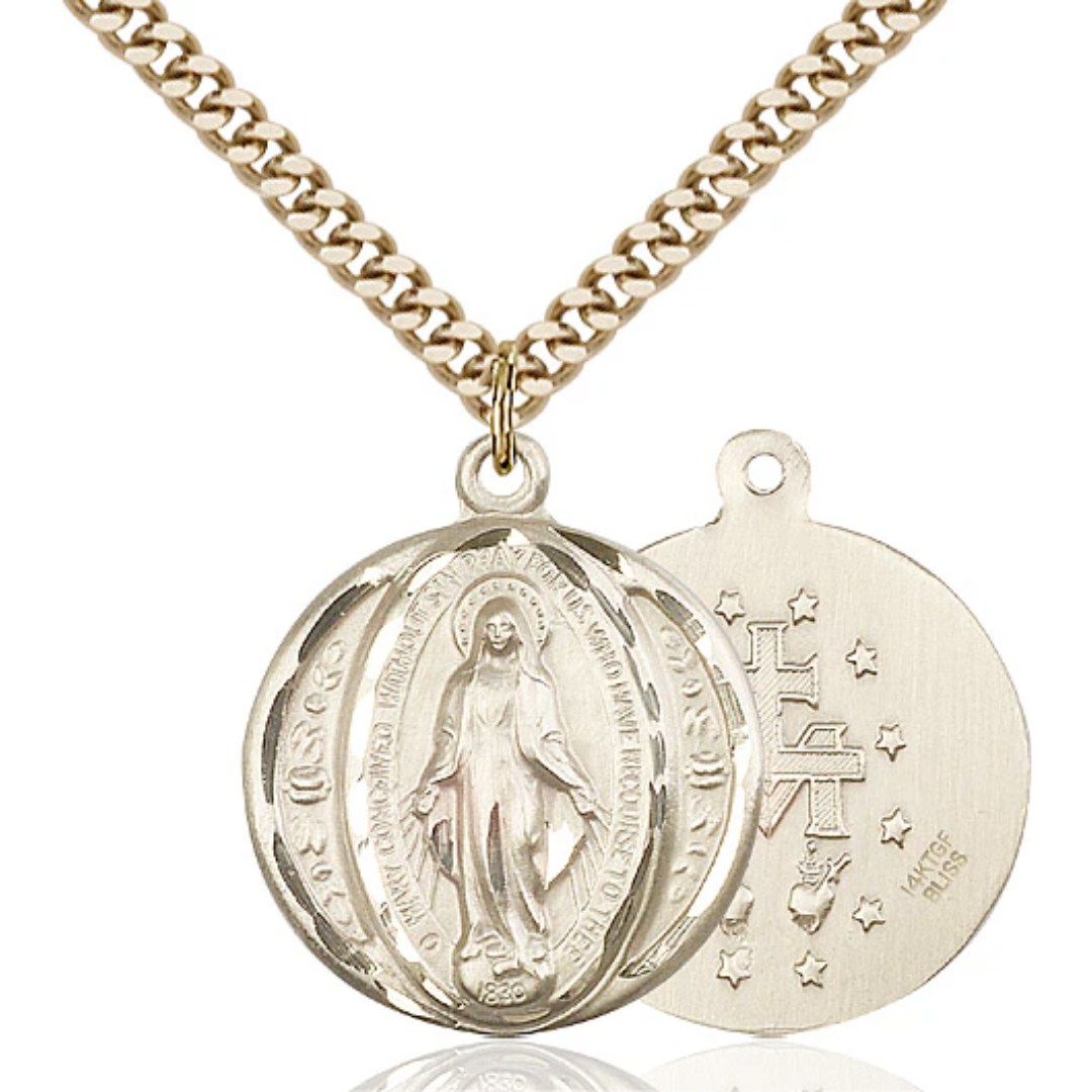 7/8 x 3/4 14kt Gold Filled Miraculous Pendant on 24 inch Gold Plate Heavy Curb Chain