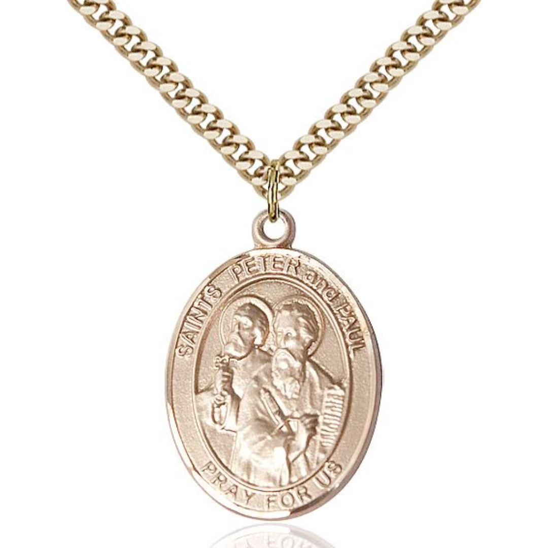 14kt Gold Filled St Peter St Paul Pendant on a 24 inch Gold Plate Heavy Curb Chain.