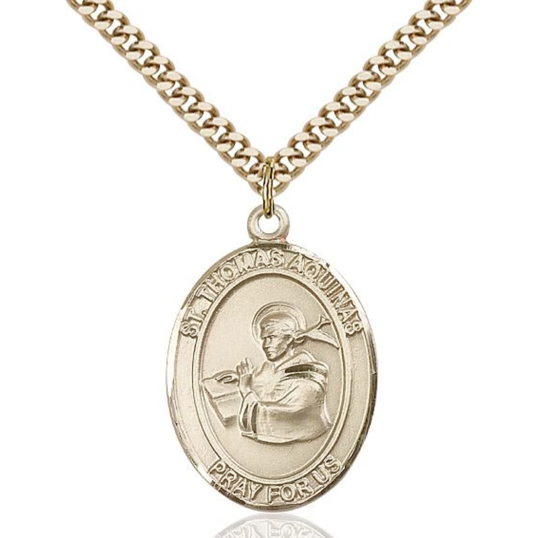 · St. Thomas Aquinas Medal.· Medal Measures 1-inch tall by 3/4-inch wide.· Chain is 24 Inches in length Endless Gold Plate Heavy Curb Chain.· St. Thomas Aquinas is the Patron Saint of Catholic Schools/Students.