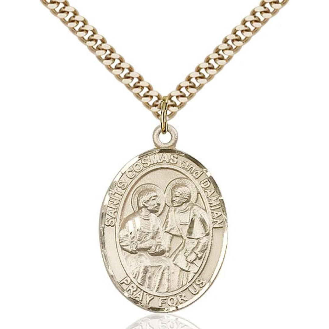 · Sts. Cosmas & Damian Medal.· Medal Measures 1-inch tall by 3/4-inch wide.· Chain is 24 Inches in length Endless Gold Plate Heavy Curb Chain.· Sts. Cosmas & Damian is the Patron Saint of Surgeons/Barbers.